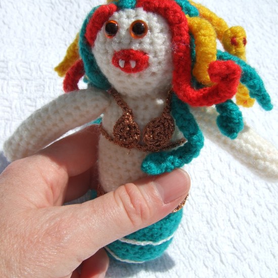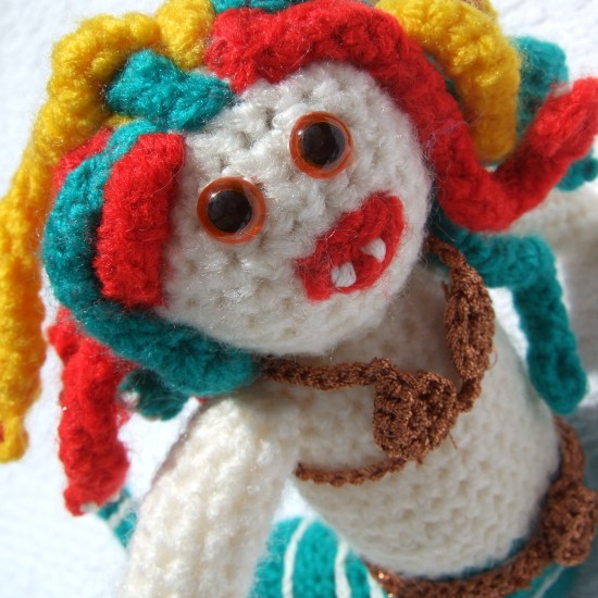 The others have faults, of course, but I was pleased with the way they turned out given my skill level at the time. This little chap is all out of proportion and nothing special. I meant to sew him velvet clothes, but I had crocheting mania, so it never happened. He got put away in my stash box and stayed there for years. After him, something clicked in my head and instead of representing myths, I started making up my own critters instead.