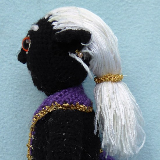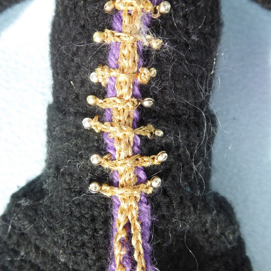 A lot of the work on his coat was done by crocheting a foundation chain through the existing work, and using it to add new pieces. This is less bulky than crocheting a whole new layer on top*. See here for the surface crochet technique, although I used regular stitches, not slip stitch.