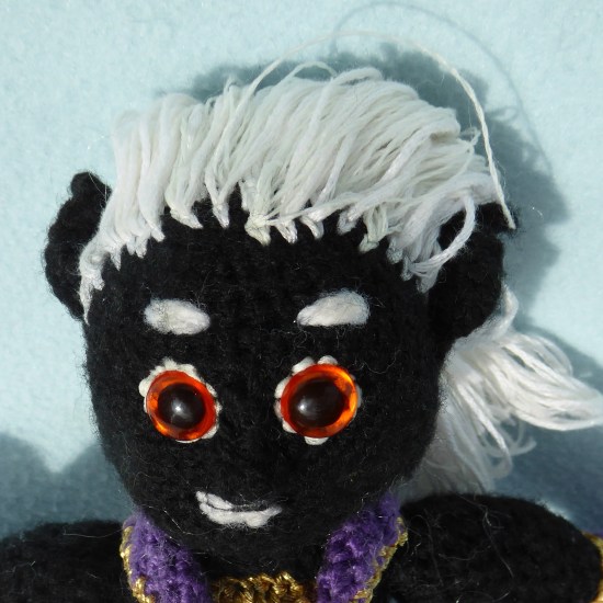 I added some details to his face (including a nose!) and I thickened up his hair with glow in the dark yarn using the latch hook technique.