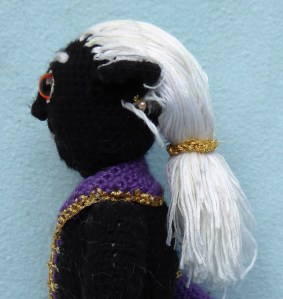 March 4, 2016March 4, 2016zola Drow Profile Crocheted a small triangle for his nose and stitched it on. Did French knots either side for nostril arches, but not sure it worked.