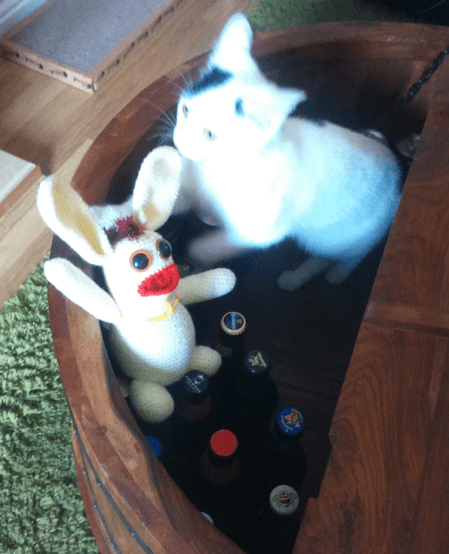 May 2, 2016May 2, 2016zola Zelda Bananas Bunny started off his evening by picking a beer from his new friend Zelda’s impressive collection.