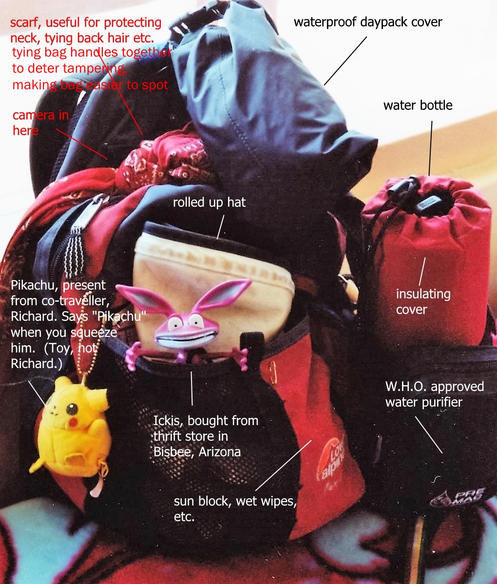 Here’s the state of my daypack when I reached Pokhara, Nepal in February 2001 at the end of 5 days on the Annapurna trail. (We did the wussiest possible circuit, but oh, the views!) As you can see, Pikachu and Ickis are watching my back.