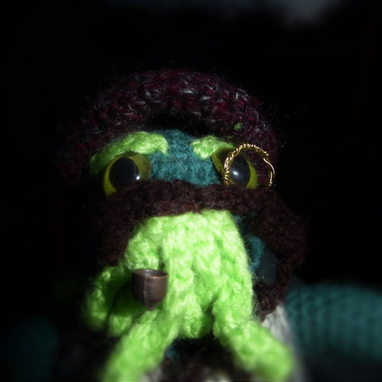 This is a special make for a friend who is a fan of H.P. Lovecraft’s work*, and a steampunk enthusiast. I decided to make him a country gentleman Cthulhu. Just because you’re driving your worshippers insane is no reason not to wax your tentacle moustache, wear a hat, and dress like a proper chap.