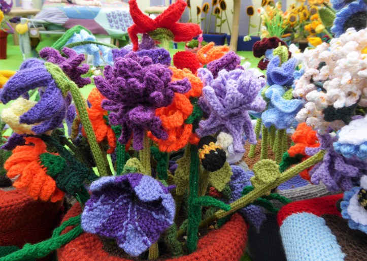 A knitted bee buzzing in the blooms.